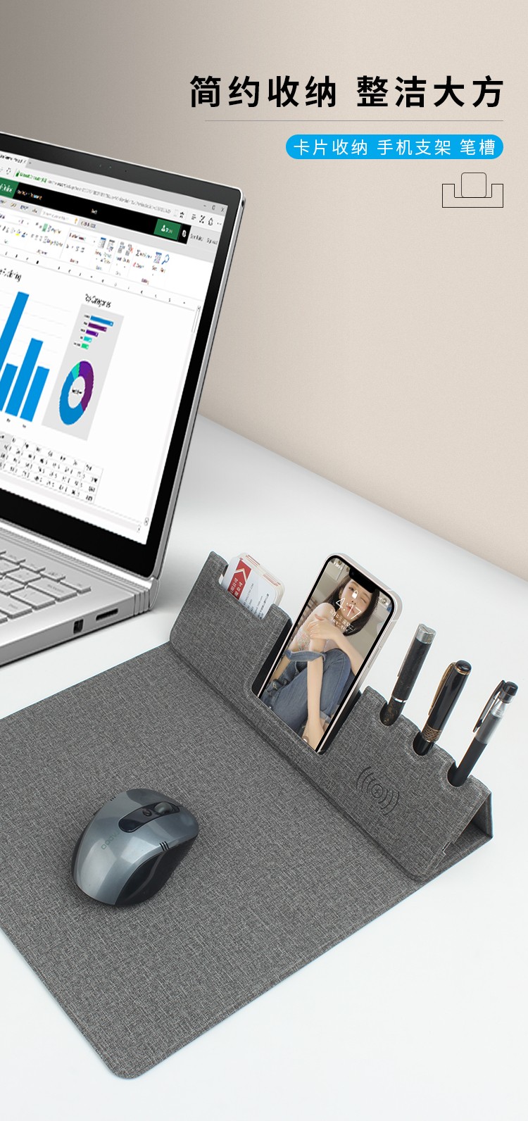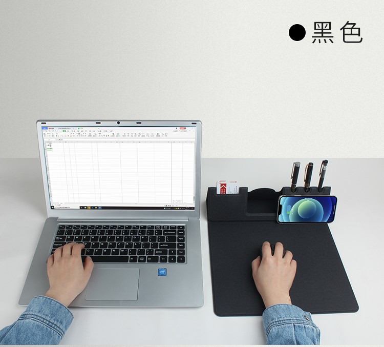 支架款無線充鼠標墊,手機一放,立即充電,給手機提供支架,布面,表面細膩、平整、操作穩定,底部淺絨,防滑穩固